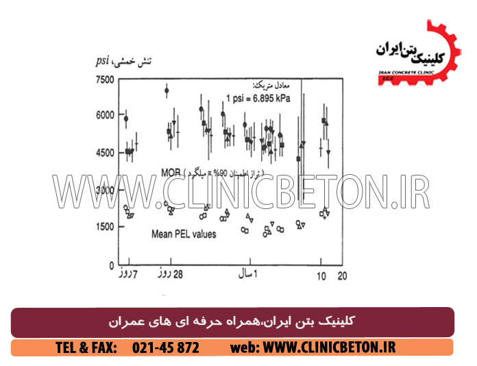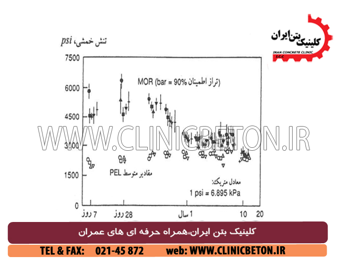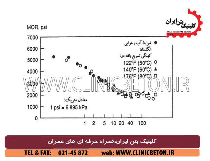 می یابد، افت مقاومت MOR سرعت بیشتری به خود می گیرد. لازم به توجه است که یک حد پایین تر برای مقاومت MOR وجود دارد. این حد پایین تر ذاتاً با PEL مخلوط، که خود معیاری از مقاومت ترک خوردگی ماتریس بتن مسلح است، برابر می باشد. سالهای بسیاری است که استفاده از روش های کهنگی تسریع یافته وسیله ای برای پیش بینی مقاومت شده است. مقاومت مدول گسیختگی که در شکل 4 نشان داده شده، برای مخلوط هایی است که در دماهای C˚50، C˚60 و C˚80 تحت فرایند کهنگی تسریع یافته قرار گرفته اند. این مقادیر با نتایج نمونه هایی که به مدت 10 سال در معرض شرایط واقعی آب و هوای انگلستان قرار گرفته اند، ترکیب شده اند. این کار با جایگزین کردن نتای مقاومت تسریع یافته در دماهای بالاتر در طول محور لگاریتمی زمان انجام می شود، به طوری که نتایج یاد شده با نتایج مقاومت مخلوط های قرار گرفته در شرایط آب و هوایی انگلستان مطابق و سازگار شوند.