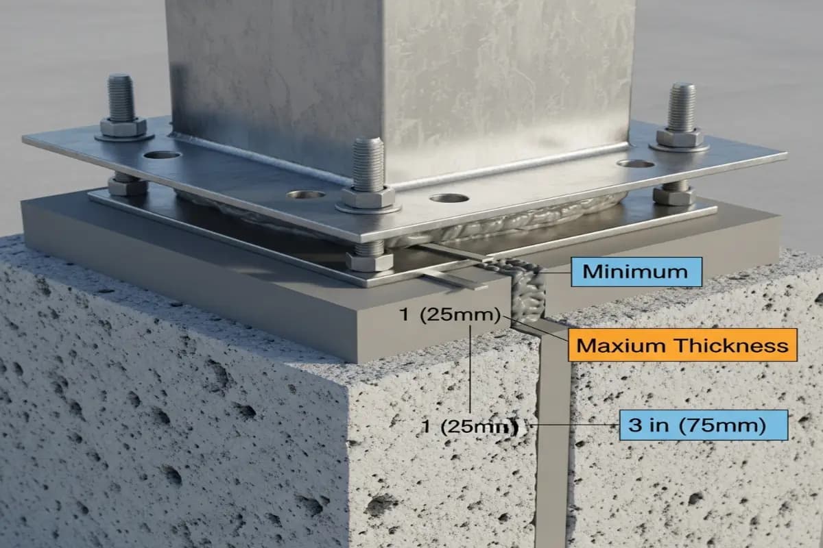 - حداقل ضخامت گروت: در کارهای ساختمانی عمومی و نصب ستون ها، حداقل ضخامت گروت زیر صفحه ستون معمولاً بین ۲۵ تا ۳۰ میلی متر (حدود ۱ اینچ) توصیه می شود . این ضخامت اطمینان می دهد که گروت غیرمنقبض شونده (Non-shrink Grout) می تواند با روانی کافی جریان یابد و تمامی تلورانس های استاندارد ساخت را پوشش دهد . در شرایط خاص و برای گروت های اپوکسی بسیار روان، این مقدار می تواند تا ۲۰ میلی متر نیز کاهش یابد.