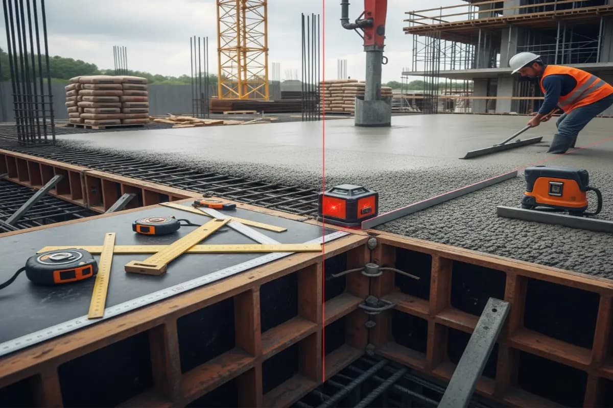 - ابزارهای اندازه گیری دقیق: استفاده از تراز لیزری یا نیول، برای کنترل مداوم تراز در طول بتن ریزی،به ویژه در کف سازی های با دقت بالا،الزامی است.