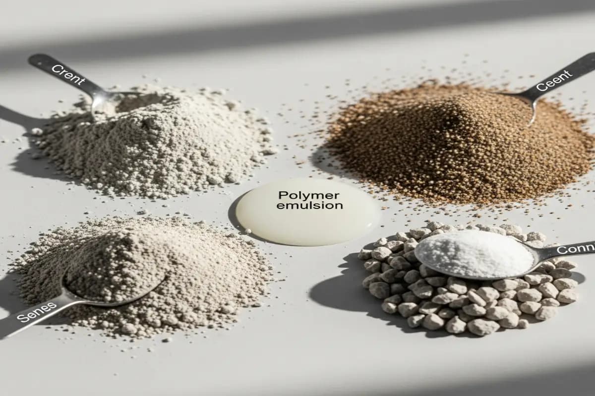 - سیمان پرتلند (Portland Cement): به عنوان بستر اصلی واکنش های هیدراتاسیون عمل می کند. در واقع، رزین های پلیمری با ذرات سیمان واکنش داده و "ملات پلیمری اصلاح شده" را تشکیل می دهند که هم چسبندگی سیمان را دارد و هم انعطاف پذیری پلیمر.
